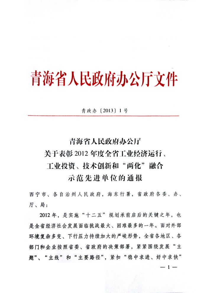 2012年,青海省物產集團總公司在省委、省政府及省國資委的大力支持和領導下,集團總公司按照全省工業(yè)經濟總體部署和要求,著力推進工業(yè)項目建設,榮獲"2012年度工業(yè)投資貢獻獎"。