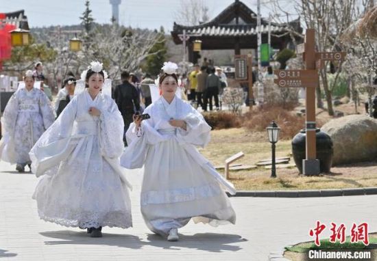 4月7日,在吉林省延吉市的中國(guó)朝鮮族民俗園內(nèi),游客身著朝鮮族服飾游玩。 中新社記者 張瑤 攝