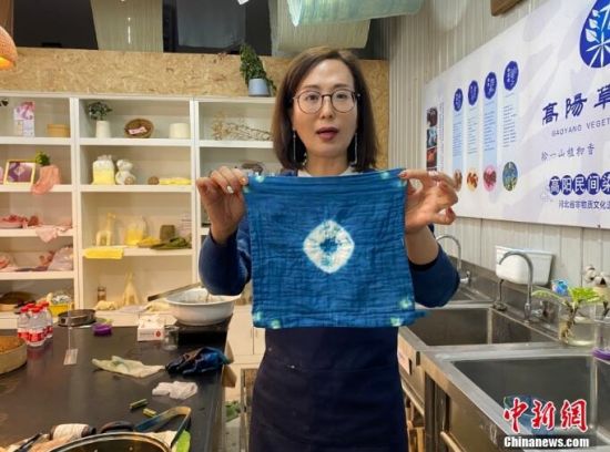 這是河北省級非物質文化遺產項目“高陽民間染織技藝”傳承人段惠,展示中國草木染及傳統(tǒng)扎染技藝的一幕!叭疽菏怯棉に{、菘藍(板藍根)等藍草提取出的,這些藍草是最古老的染材!倍位菡f。