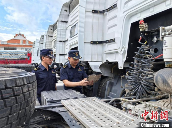 海關(guān)關(guān)員在關(guān)累港口岸對(duì)出口重卡牽引車開展查驗(yàn)!】得 攝
