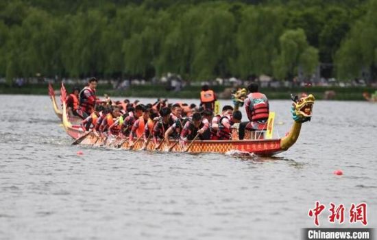 中新網(wǎng)長(zhǎng)春6月22日電 (記者 郭佳)22日是中國傳統(tǒng)節(jié)日端午節(jié),吉林省第一屆全國龍舟邀請(qǐng)賽在長(zhǎng)春伊通河舉辦,吸引來自吉林、安徽、廣東、河北等地的16支隊(duì)伍、約300人揮槳逐浪,奮勇爭(zhēng)先。