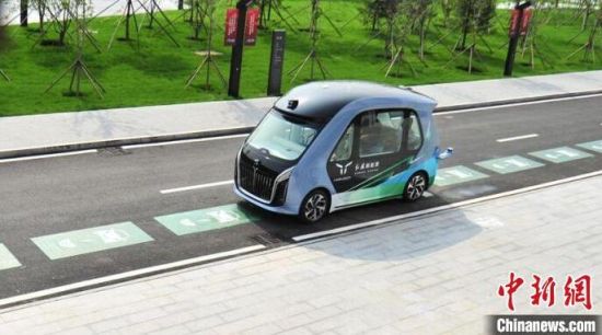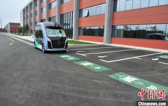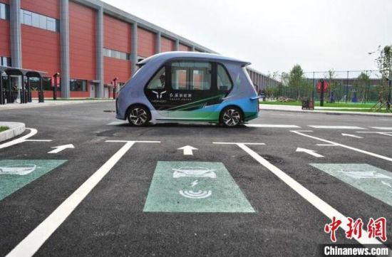 一輛新能源電動(dòng)車駛過高功率動(dòng)態(tài)無線充電道路系統(tǒng)的泊車位。