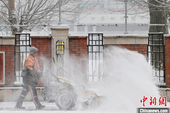 11月26日,吉林長春,市民在清掃車上的積雪。當(dāng)天,吉林長春迎來今冬首場明顯降雪天氣,整座城市披上銀裝。 中新社記者 張瑤 攝