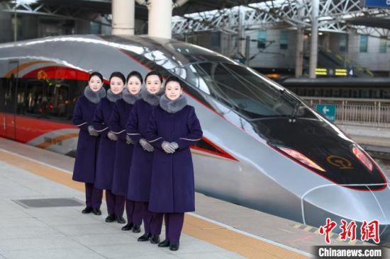 1月4日,在長(zhǎng)春站站臺(tái),列車乘務(wù)人員與“智能復(fù)興號(hào)”動(dòng)車組拍照留念。李鵬博 攝