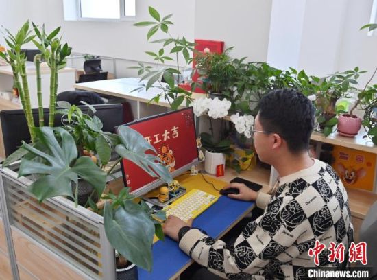 2月14日,吉林長(zhǎng)春,一名員工將工位改造成“森系工位”。 張瑤 攝